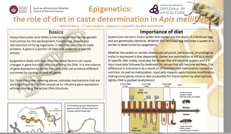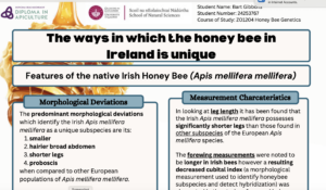 Here we will post presentation notes, slides, information on various topics that may be useful to Irish beekeepers. here I also include posters on various (mostly genetics) topics prepared by the students of the Diploma in Apiculture in 2025. They are excellent tibbets of information made by beekeepers for beekeepers. They were on display at the Native Irish Honey bee Society national conference in march 2026.